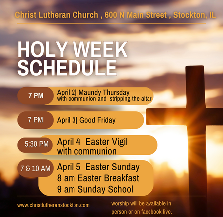 IN OUR PRAYERS TODAY: Teresa Hesselbacher, Elaine Schlicting, Darlene and Walt Steffes, Bob Schreck, Delores Wampfler, Marge and Gerald Arnold, Don & Judy Brudi, Pat Lawfer, Nancy Dittmar, Karen Dick, Angie Broshous, Grayson Raab, Lisa Law , James Dieter, Christine Happ, Kay Hesselbacher, Mary Lou Bunker, Lillian Sefford, Cindy Kerchner, Russ Synder, Don Kunz, Johnny Blair, Jim Sullivan, John Becker, Cheri Broge, Nancy Bailey, Terry Calhoun, Pastor Lee Leubke (Allure, Mt Carroll) To add someone to the prayer list please contact Pastor Chrissy